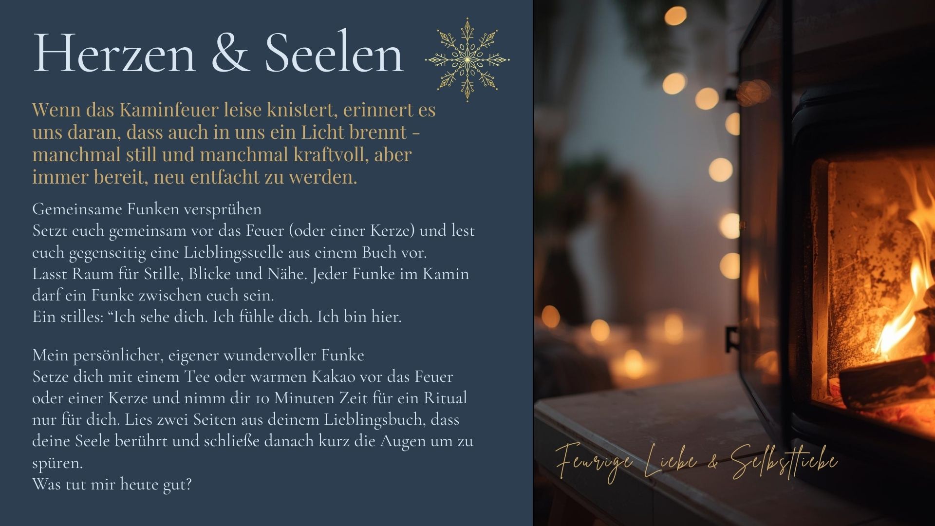 Herzen & Seelen berühren sich oft nicht in großen Worten. Sie berühren sich in Blicken. In Stille. In diesem gemeinsamen Sitzen vor einer Flamme, die nichts fordert. Nur da ist. Jeder Funke im Kamin darf ein Funke zwischen euch sein. Ein leises „Ich sehe dich“. Ein stilles „Ich bin hier“. Nähe muss nicht laut sein, um echt zu sein.